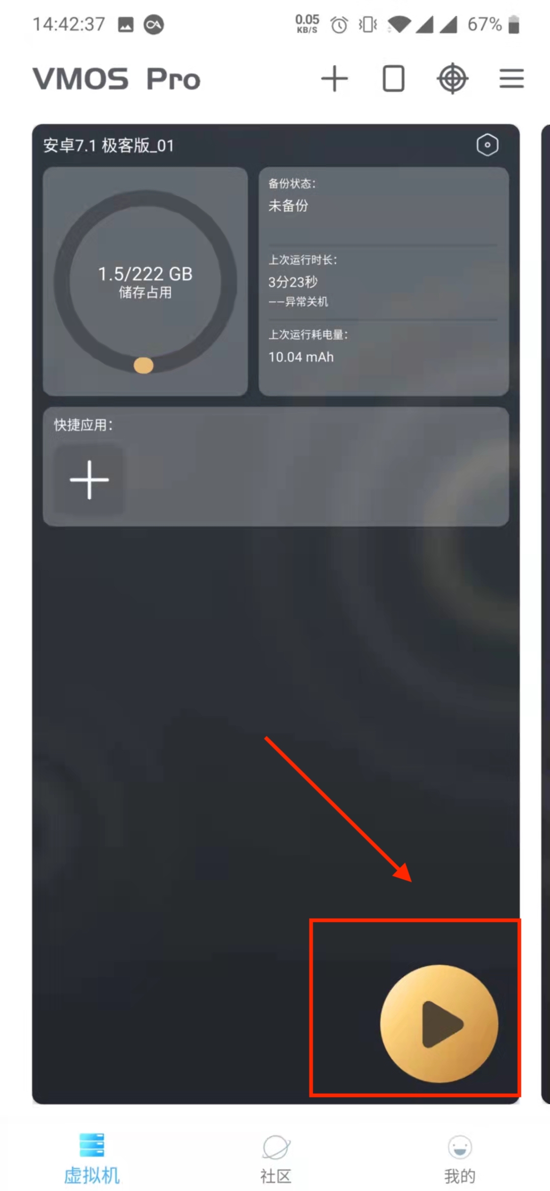在网盘中下载VMOS,安装完后,打开VMOS,点击右上方的+按钮添加虚拟机,选择最下方的安卓7.1极客版,下载并安装完成。