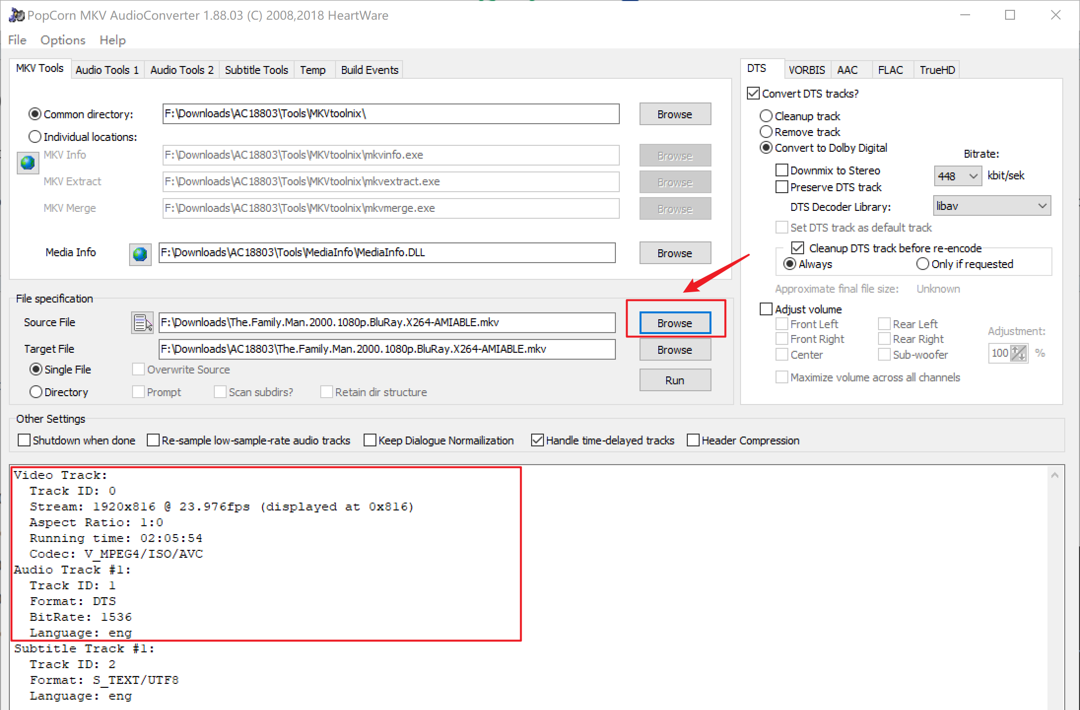 打开软件,点击File specification中的Browser,打开需转换 DTS 的 mkv 视频文件,打开后在下方会显示相关视频信息。